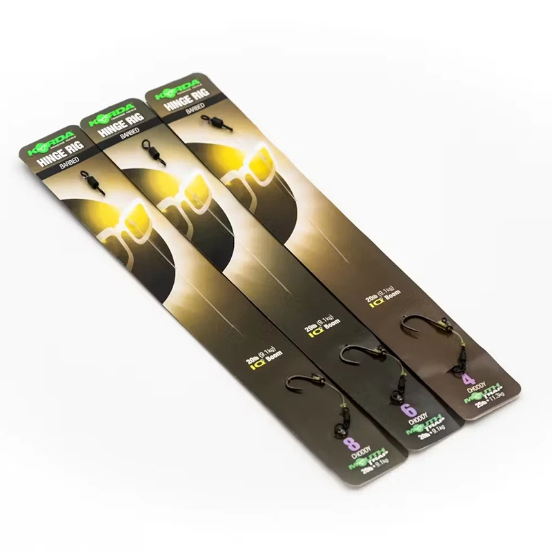 The hinge rig, notoriously tricky and complex to assemble, now available in a ready-tied by Korda to Danny Fairbrass' exacting standards. The hook section is beautifully curved to allow the hook to spin into prime hooking position every time a fish mouths the bait and the IQ boom will kick the hook bait away from the lead on the cast, ensuring perfect presentation. 3 per pack Features Ready-tied stiff Perfect for catching bigger carp Tied with Choddy hooks, Mouth Trap and IQ2 fluorocarbon to Danny Fairbrass' exacting specification Available in sizes 4, 6 and 8. Specifications Size 4 choddy hooks - 20lb IQ2 fluorocarbon – 25lb Mouth Trap Size 6 choddy hooks - 20lb IQ2 fluorocarbon – 20lb Mouth Trap Size 8 choddy hooks - 20lb IQ2 fluorocarbon – 20lb Mouth Trap