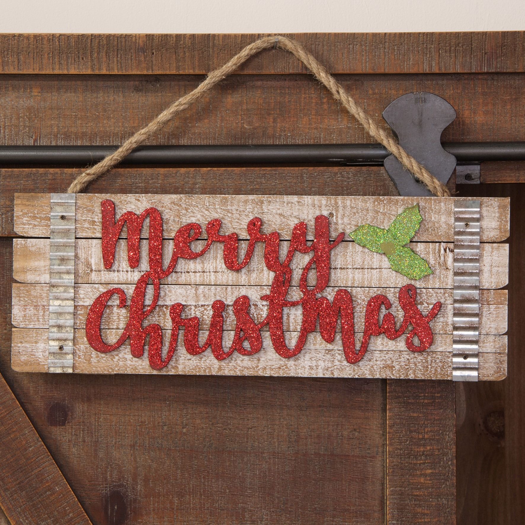 Festive hanging plaque with Merry Christmas written in red glitter on a wooden background. Size: 35cm