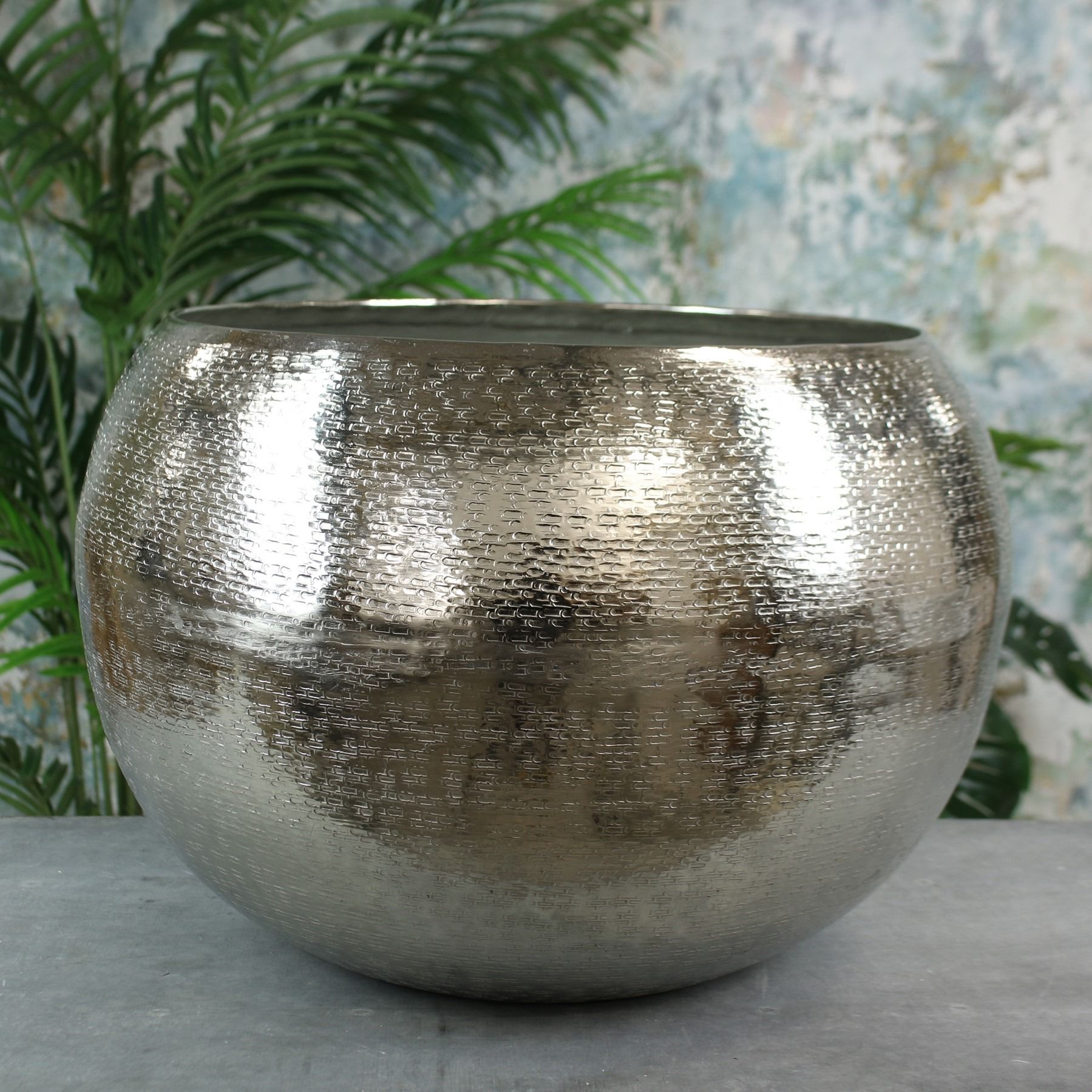 With a contemporary, hammered finish, this planter is ideal for styling your houseplants.Please note this planter is not guaranteed to be watertight so we would recommend the use of a liner or floral foam.