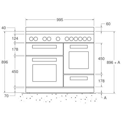 Gas hob with 6 burners:Heavy duty cast iron pan supports Automatic single handed ignitionFlame failure safety deviceLeft oven:Multifunction electric oven with 9 functions:Convection, top element, bottom element, grill, fan assisted, fan assisted grill, true fan, pizza, quickstartCapacity 69 litresRight oven:Conventional electric oven with 4 functions:Convection, top element, bottom element, grillCapacity 54 litresSeparate grill compartment:Capacity 24 litresInterior lightsTriple glazed doorsSoft close storage drawerIntegrated plinthAdjustable feetDimensions: h895-915 x w995 x d600mm (excludes 60mm back guard)Matching cooker hoods and splashbacks available