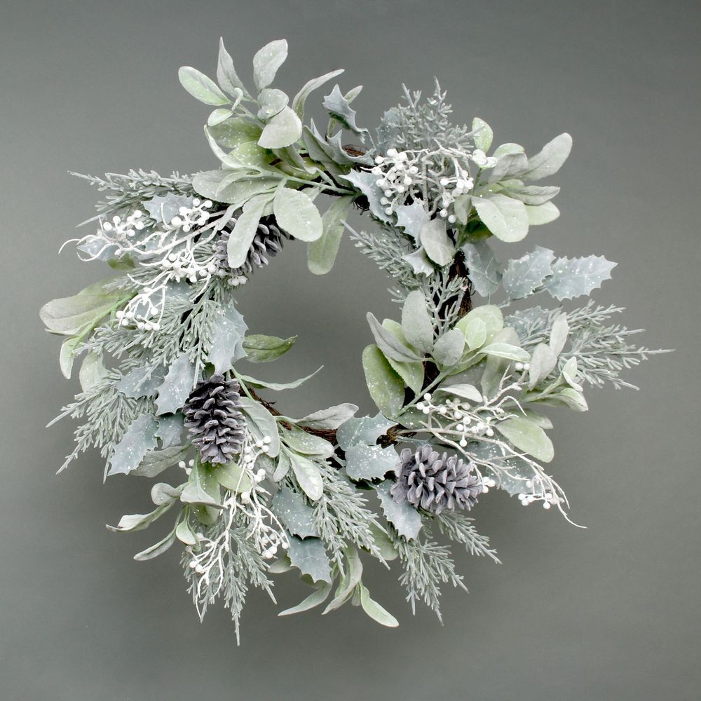 With lamb's ear, holly, pine cones & white berries in a flocked finish, this wreath is designed to have plenty of interest and a realistic style.With a full look, this wreath is designed to be displayed on doors and walls for a wintry addition to your decorations.Please note this wreath is not designed to be used outside for prolonged periods.
